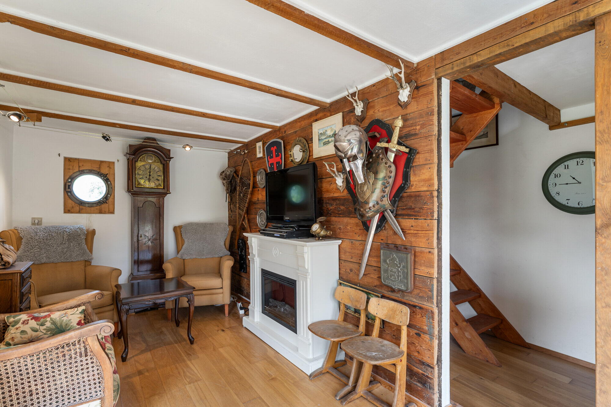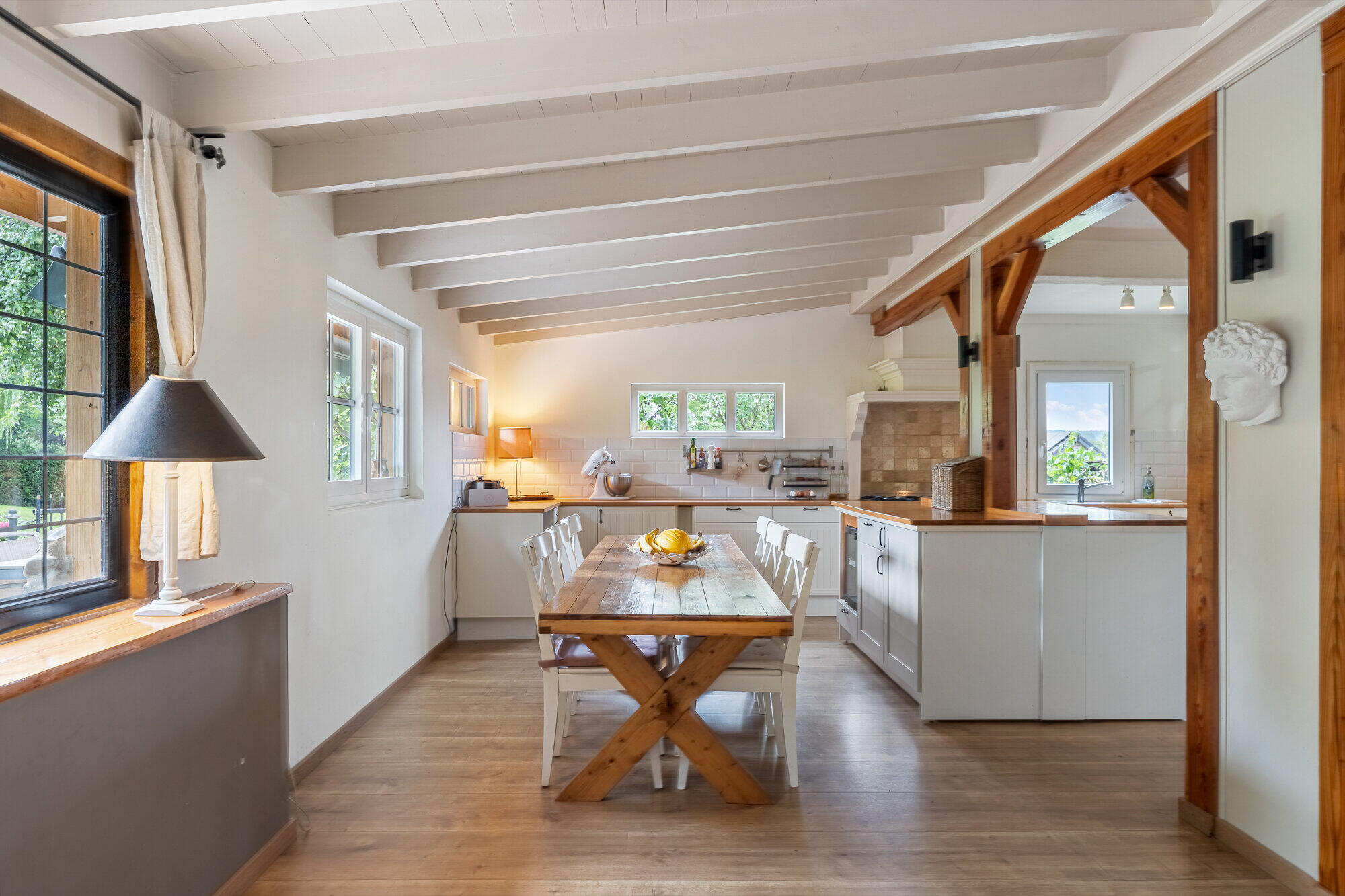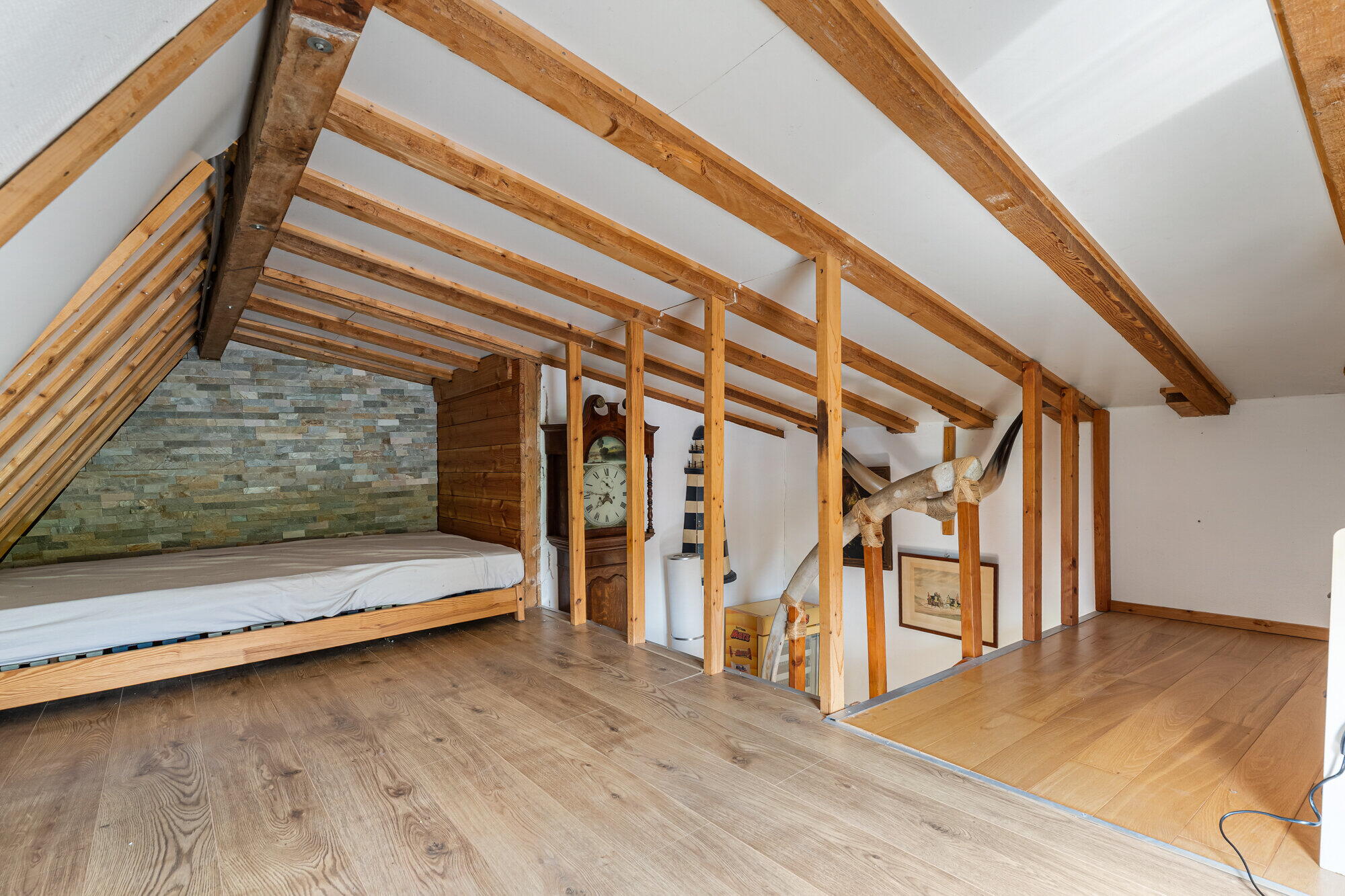 Het interieur combineert moderne en traditionele elementen, met houten vloeren, schuine plafonds en ingebouwde opbergruimte. De woning beschikt over airconditioning en praktische ruimtes zoals een wasruimte.
