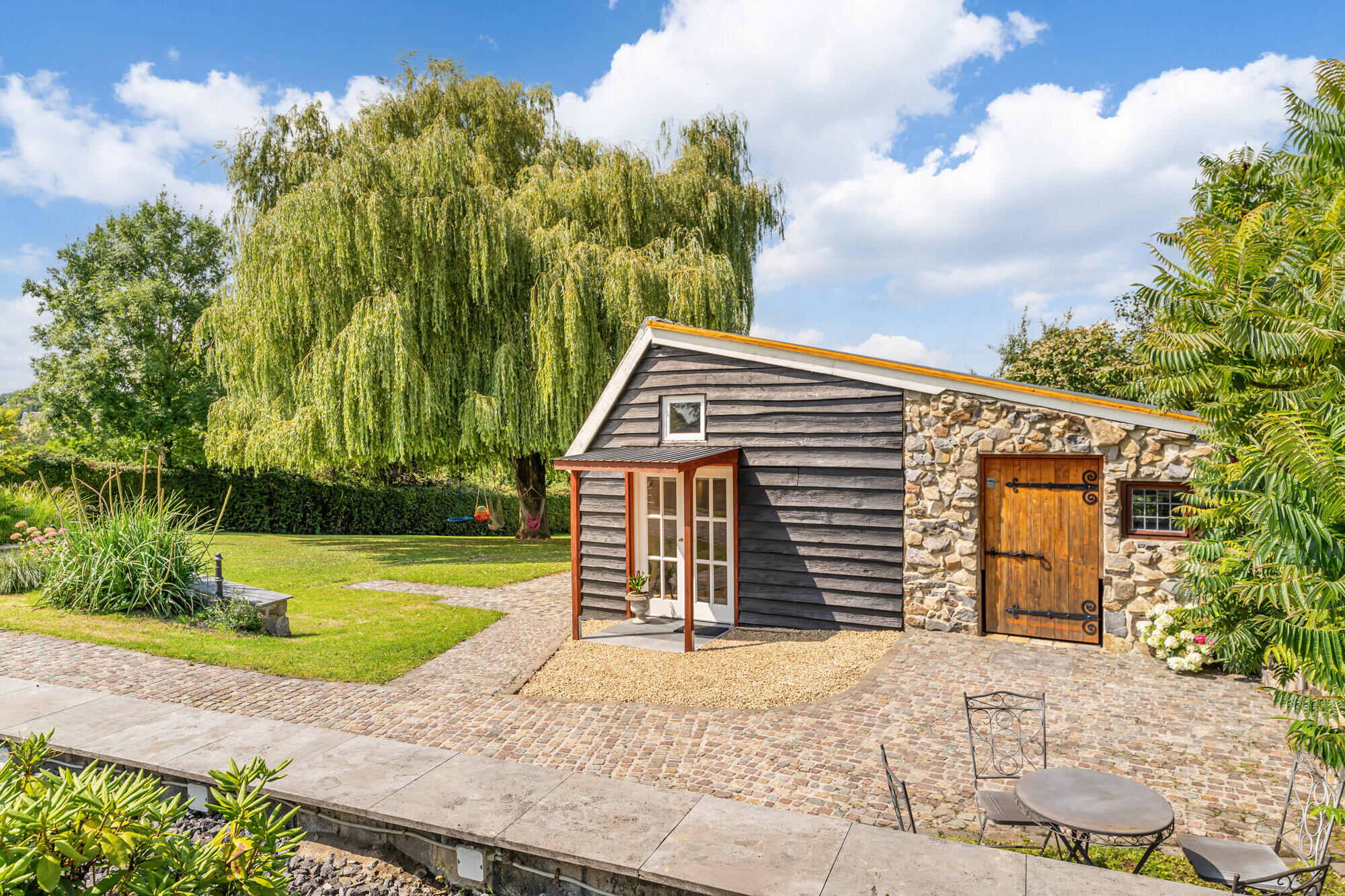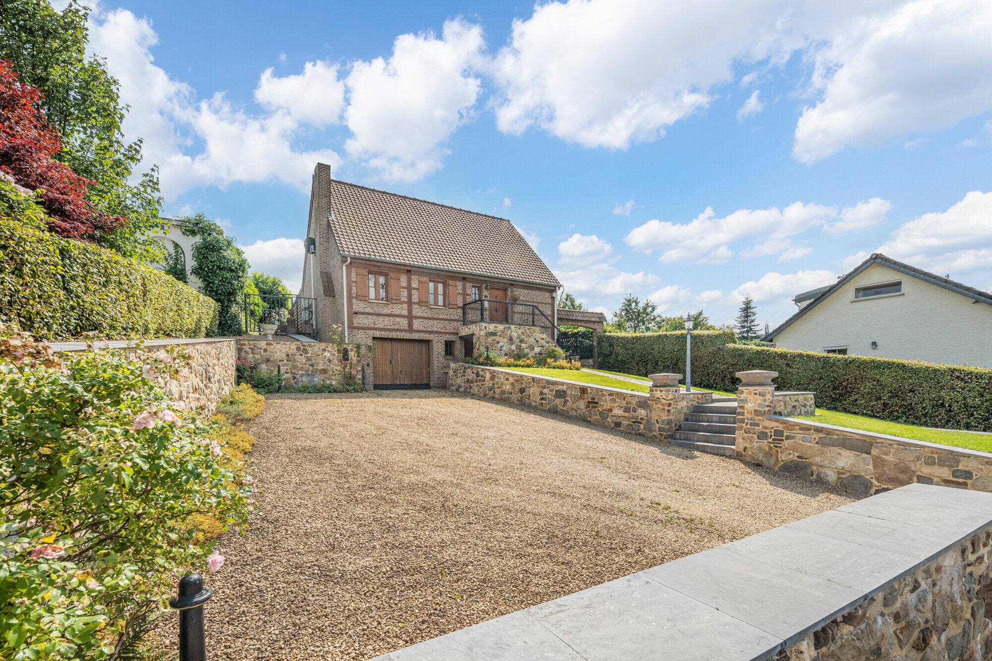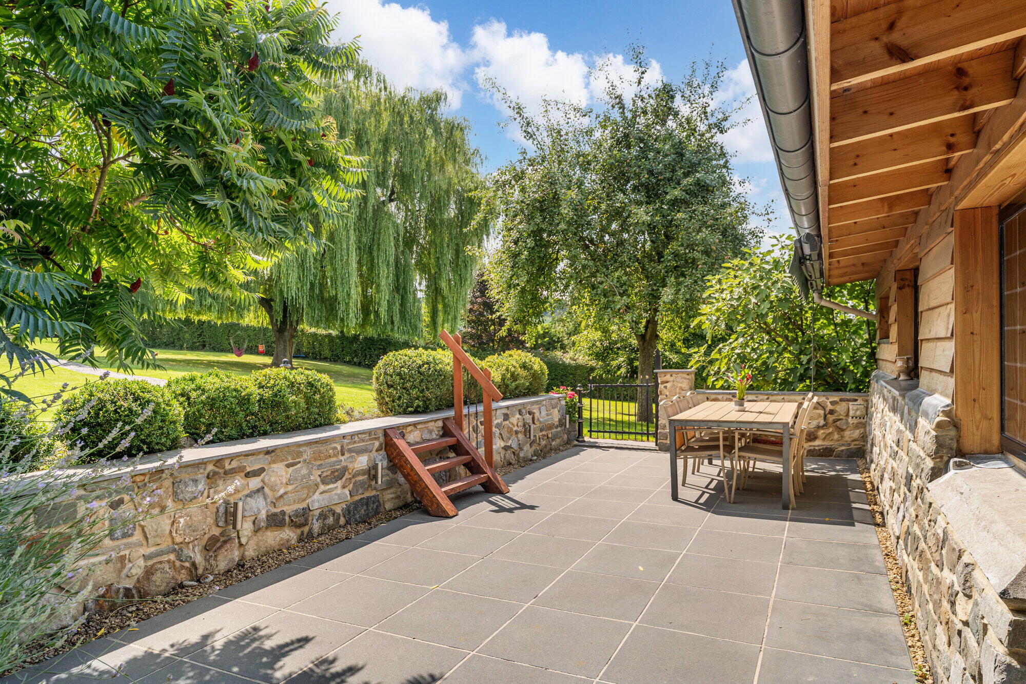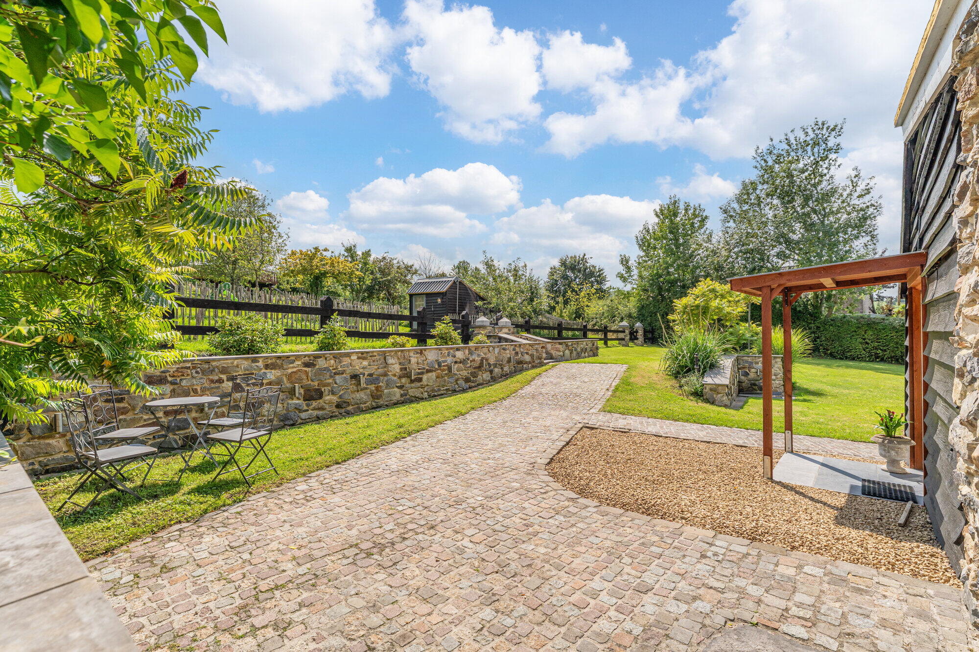 Buiten vindt u een fraai aangelegde tuin met gazon, volgroeide bomen en een terras met stenen muur. De charmante architectuur sluit perfect aan bij het landelijke karakter van de omgeving. Ook de voorkant van het huis is volledig bemuurd en verlicht met natuursteen met een parking dat plaats bied voor 6 autos.