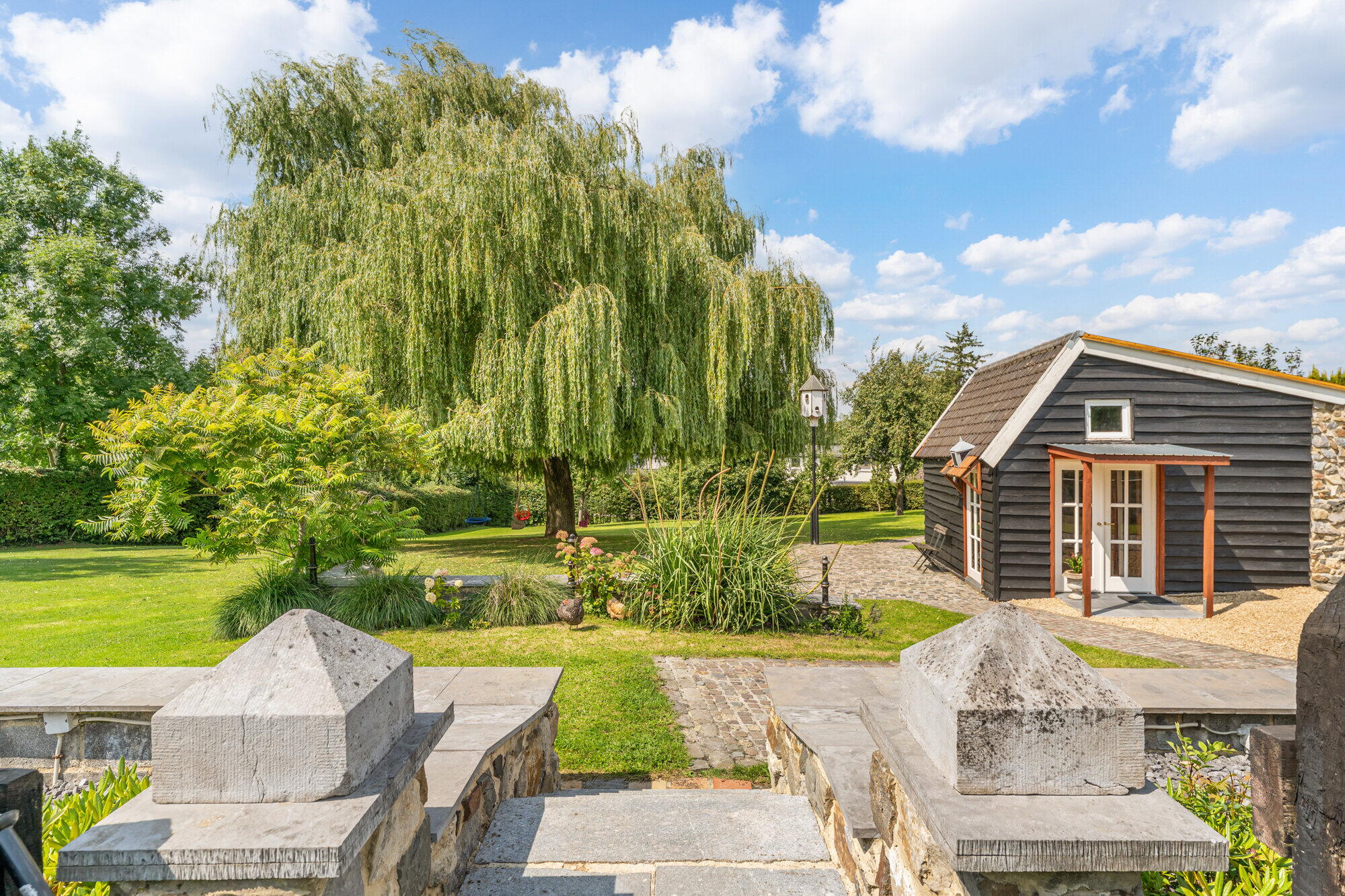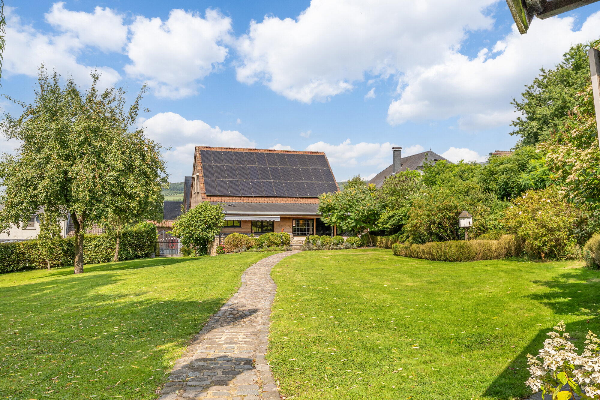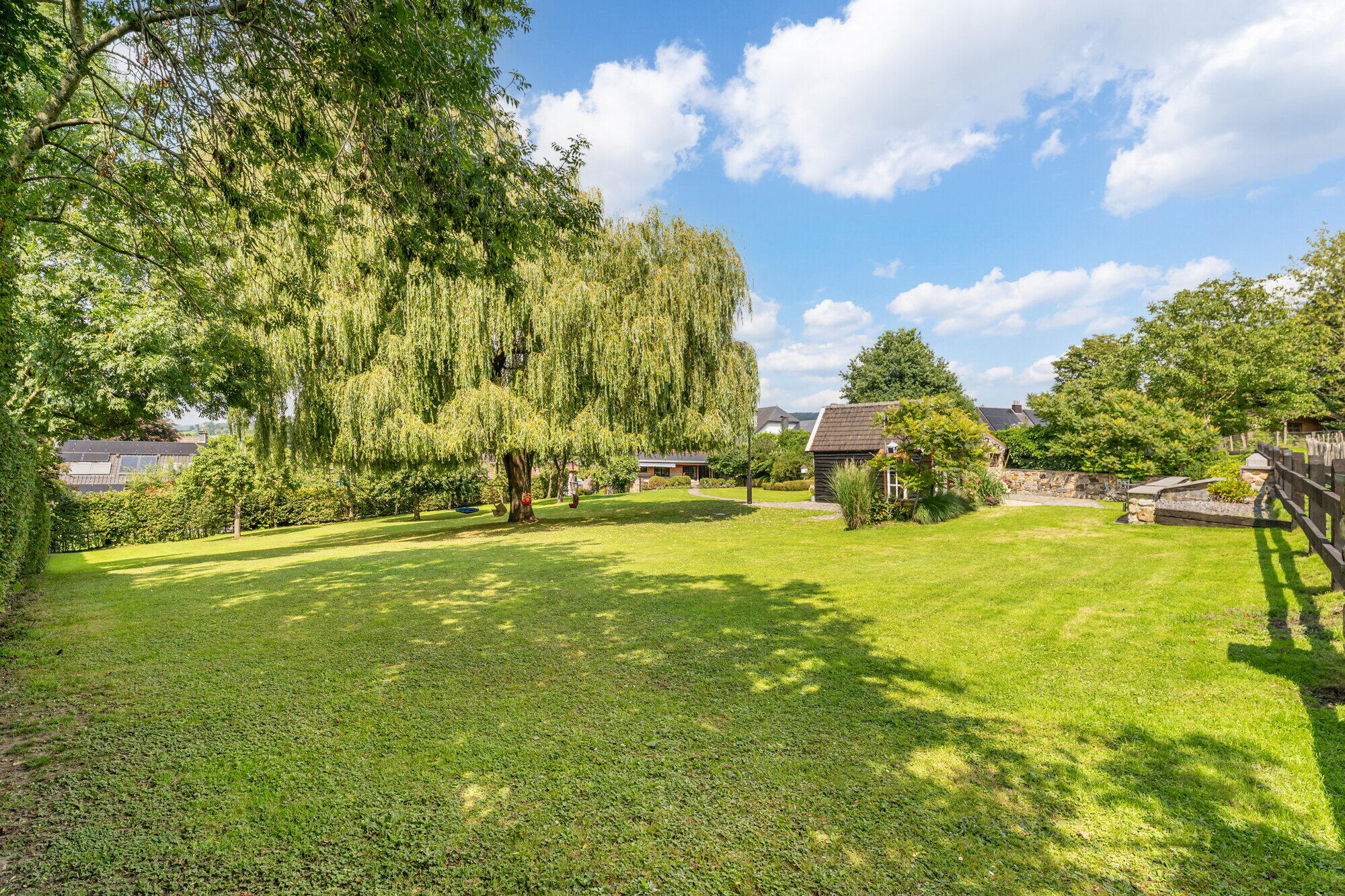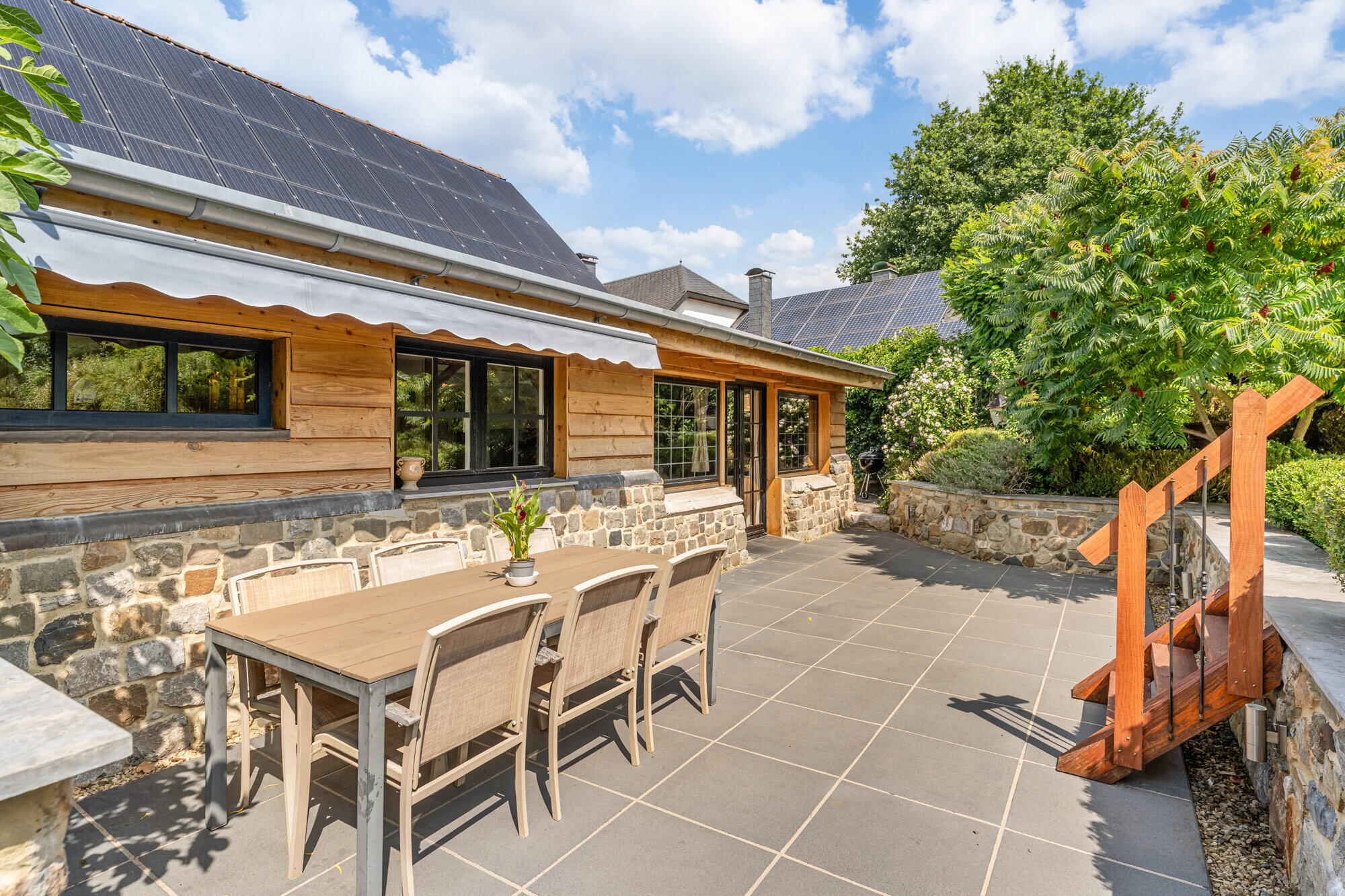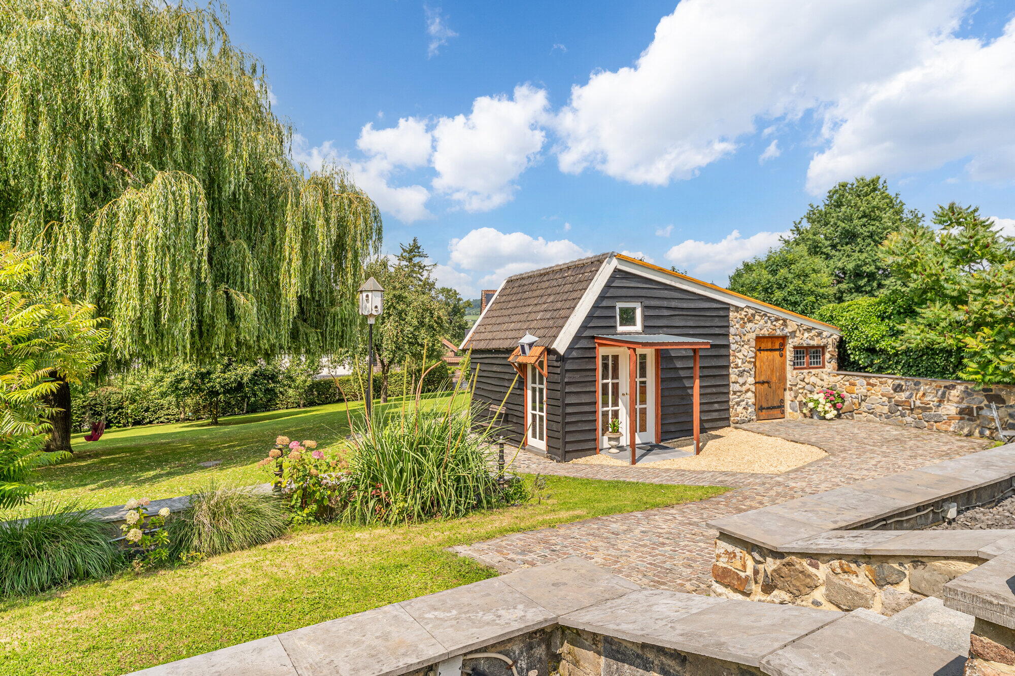 Buiten vindt u een fraai aangelegde tuin met gazon, volgroeide bomen en een terras met stenen muur. De charmante architectuur sluit perfect aan bij het landelijke karakter van de omgeving. Ook de voorkant van het huis is volledig bemuurd en verlicht met natuursteen met een parking dat plaats bied voor 6 autos.