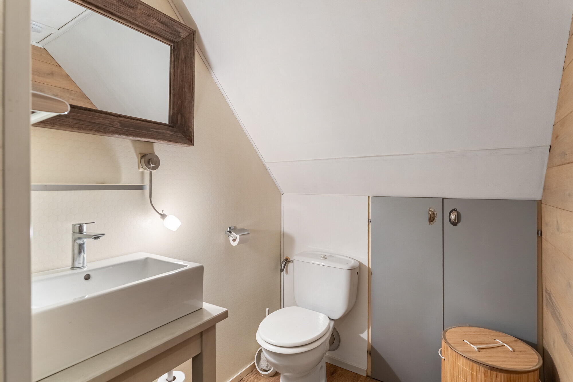 - Badkamer met douchecabine, enkele spoelbak, toilet en inbouwkasten.