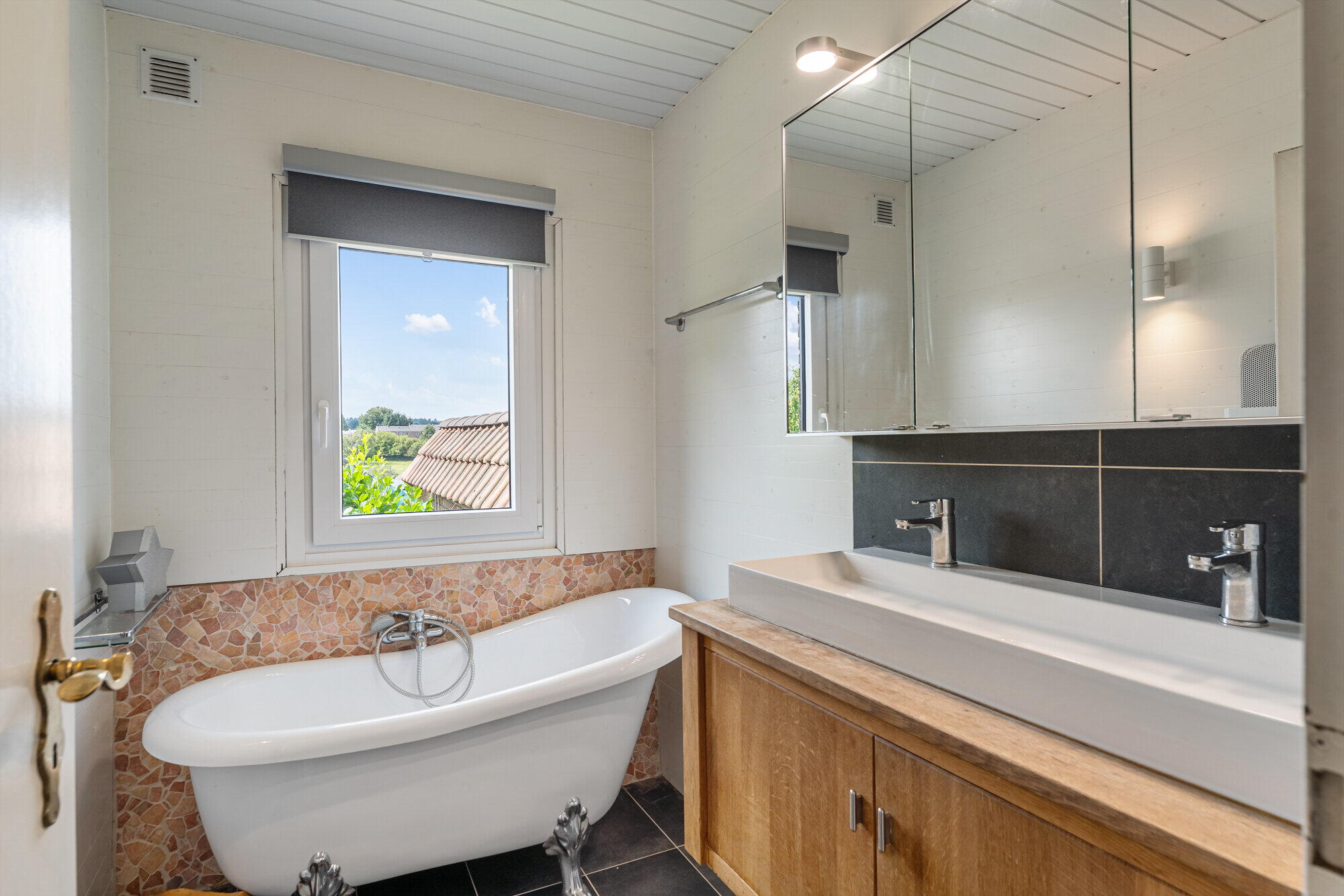 - Badkamer (2021) met dubbele wasbak en onderkast, spiegelkast, bad, tegelvloer en elektrische verwarming;